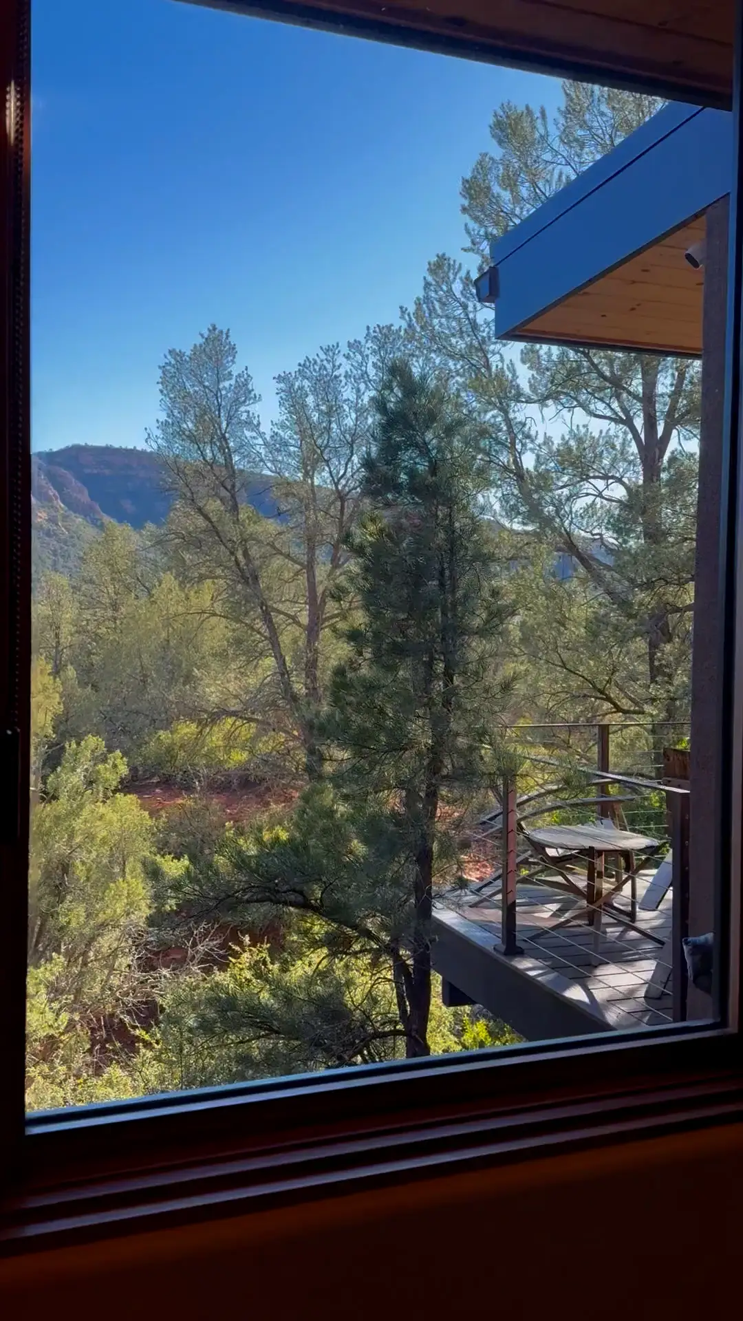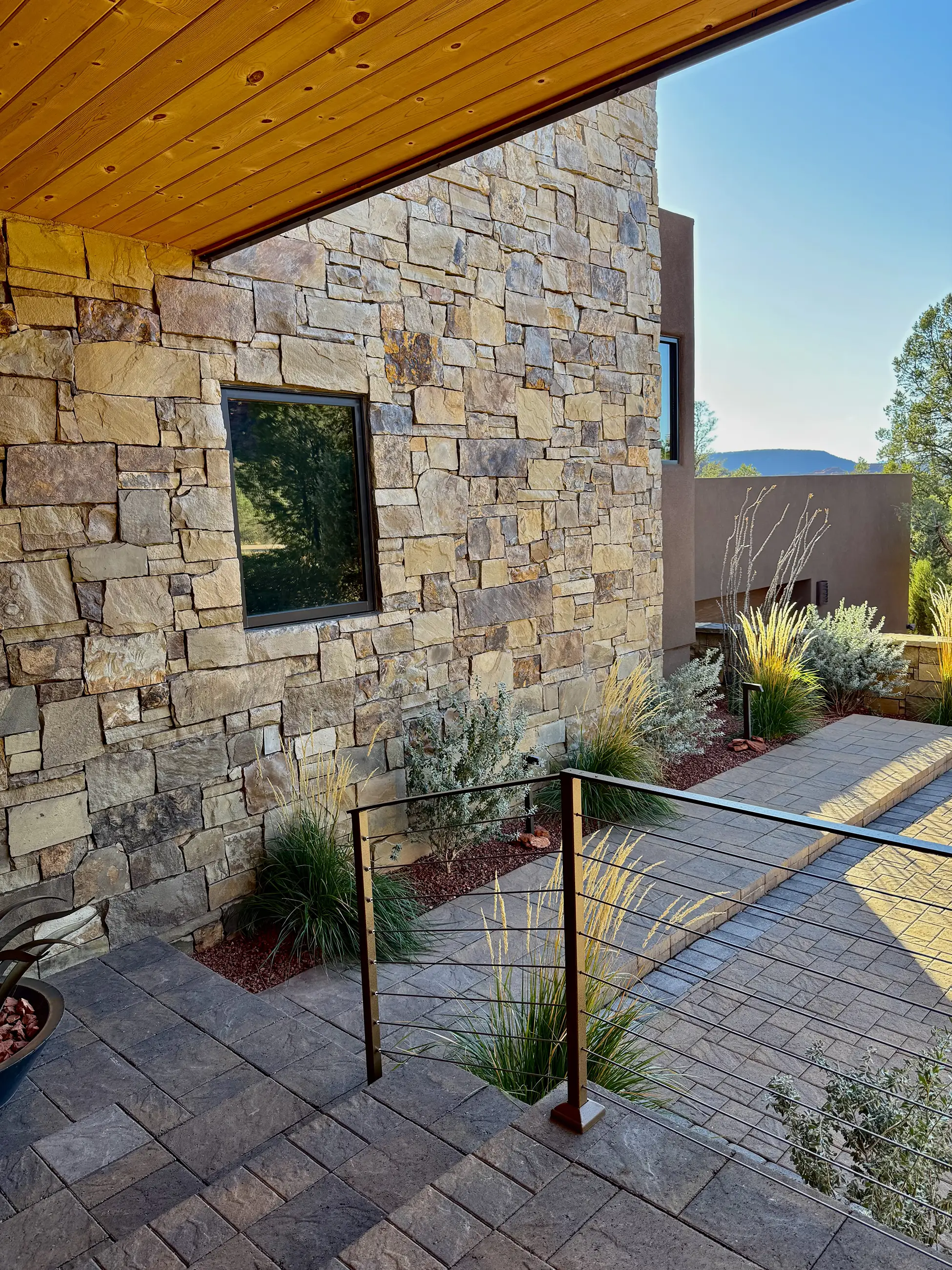 This was an interesting project. The client had purchased a lot in CR Ranch in Sedona, which had a small, heavily treed building envelope with sloping topography, and was surrounded on three sides by major drainage channels (one which had what he referred to from the start as ‘the waterfall’). As with all challenging lots in Sedona, the nature of the lot availed us of an opportunity for unique solutions. Capitalizing on putting the owner at a handshake with the trees on the lot as well as the ‘waterfall’ et al, as well as levels to coordinate with the topography and taking in the views, we entrained all the potentials of this contemporary southwest home into our solution in unique yet simple and elegant ways.
