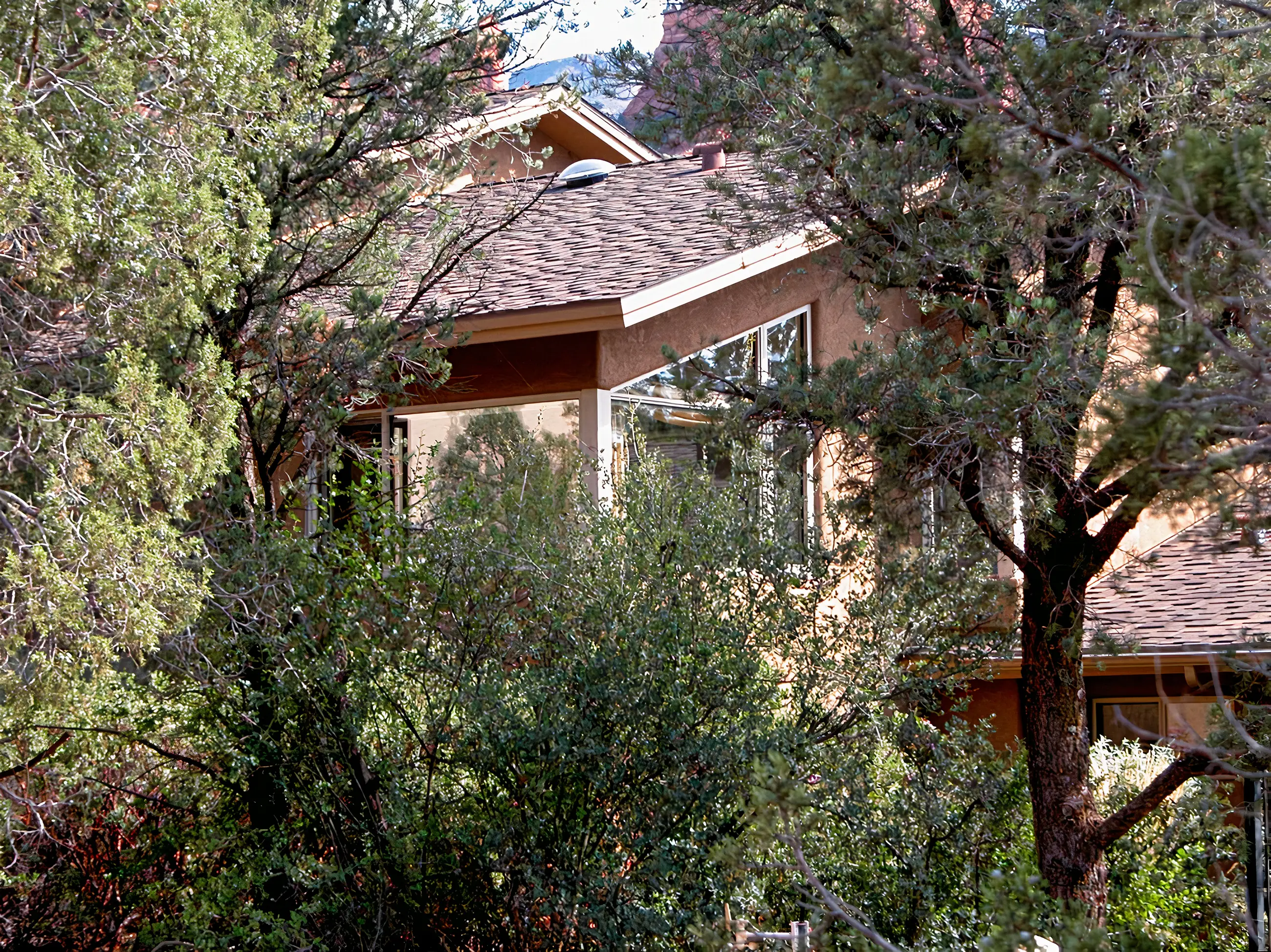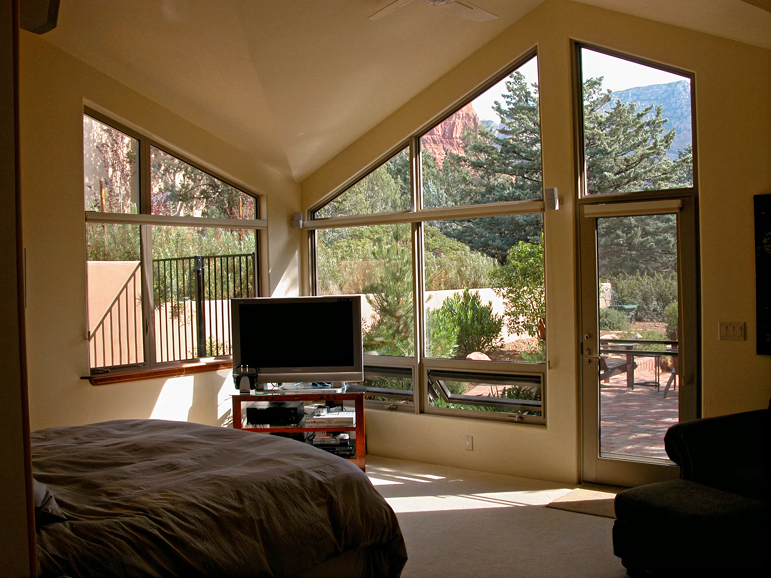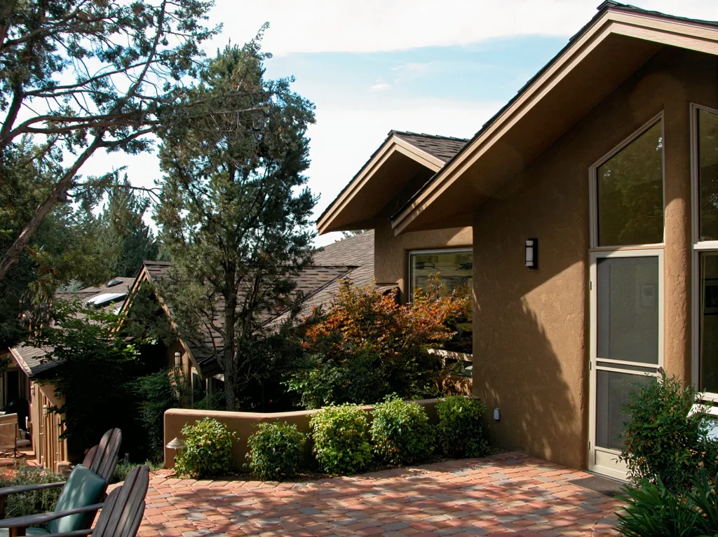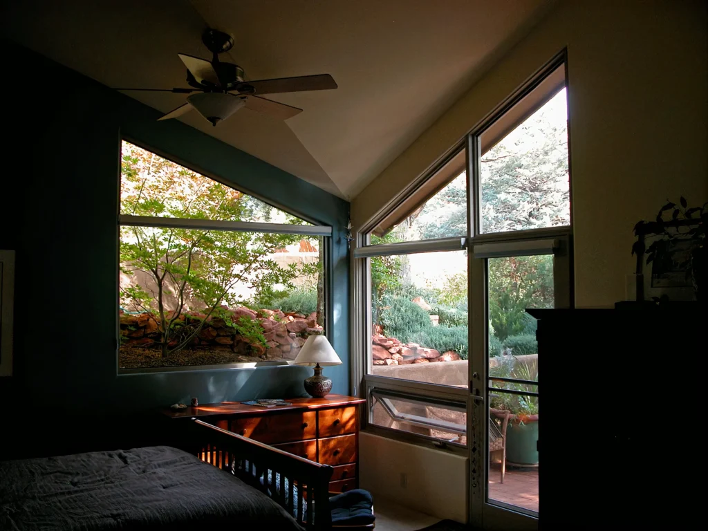 In this addition and remodeling project, we added 1400 square feet to a 2400 square foot home. Since the owners couldn’t see the beautiful views for the existing low eaves, rooflines were changed to achieve open views and more architectural interest at the same time. Included in the addition was a master suite incorporating master bedroom, master bath, his and hers walk-in closets, workout room and meditation room. Another unique feature was the soundisolated and acoustically designed music room for one of the owners, who is a composer and musician. And as with some other designs, the end result of the design was a very indoor-outdoor home with a tranquil, Zen-like feel. Very Sedona.